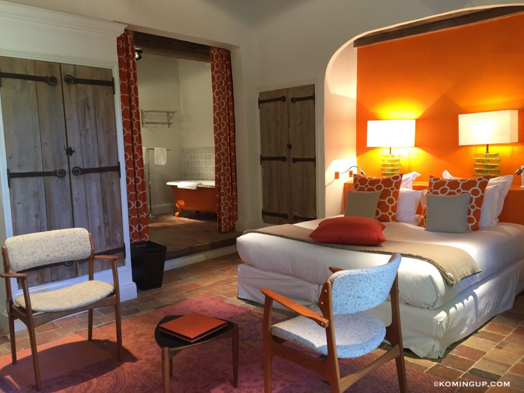 Quand elles ne sont pas signées, les pièces sont garanties originales et en vente au Hameau. Pas un objet qui ne se départisse d’une ravissante étiquette de cuir indiquant son origine, sa date de création et son prix. C’est bien simple, j’avais une folle envie d’acquérir la paire de fauteuils cinquante de ma suite, la table basse, le bahut et les sublimissimes lampes posées sur la tête de lit datant des années 70. Revival 😉