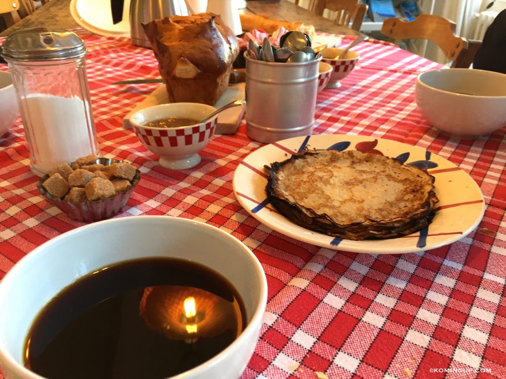 Même le petit déjeuner semble figé dans le temps avec sa nappe à carreau, ses bols fifties, ses confitures et crêpes maison…Ah oui, car j’ai oublié de vous préciser qu’outre son sens inné de la déco, son amour des vieux objets, Luc est également un cuisinier hors-pair qui n’a pas son pareil pour faire de votre repas un repas de fêtes, improvisé en quelques minutes selon la pêche du jour et les légumes du potager. Il s’est même installé une cuisine d’été sur sa terrasse 😉