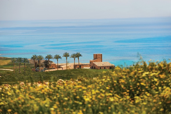 Depuis l’aéroport de Palerme, la route file vers le sud ouest de l’île au milieu de champs de blé couleur miel. Après environ 1h30 de voiture (la route est belle ;-)), le parfum des orangers et des citronniers s’enchevêtre aux odeurs de thym. Au terme d’une montée impressionnante, alors que l’entrée du Verdura Golf & Spa Resort apparaît et que la mer d’un bleu turquoise se dévoile, défilent enfin sous nos yeux 230 hectares de green qui viennent plonger dans la Méditerranée, bordée de palmiers géants et survolée par des alouettes. Subitement, l’envie nous prend d’une indolence quasi immobile, le « farniente », comme disent les italiens !!!