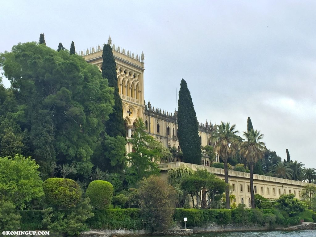 À l’est se trouve la partie la plus élevée, au sommet de laquelle est posée une «villa» comme on dit par ici. Comprendre: un palais, de style vénitien, majestueux. La partie ouest de l’île, qui surnage à peine au-dessus des flots, pointe vers la côte comme un index.